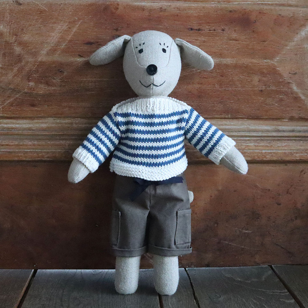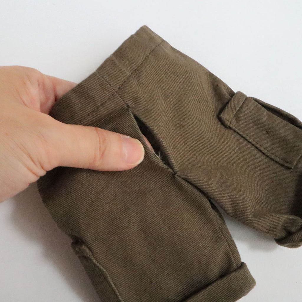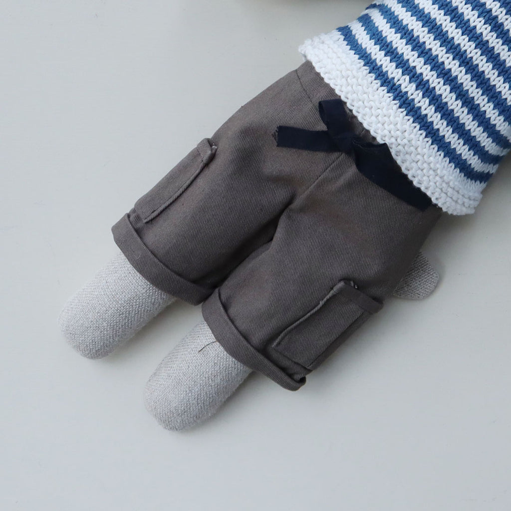カーゴパンツは絵本の中ではフラクシィが着ていますが、クゥクゥ用につくる場合はしっぽの穴を残さずに縫ってください。