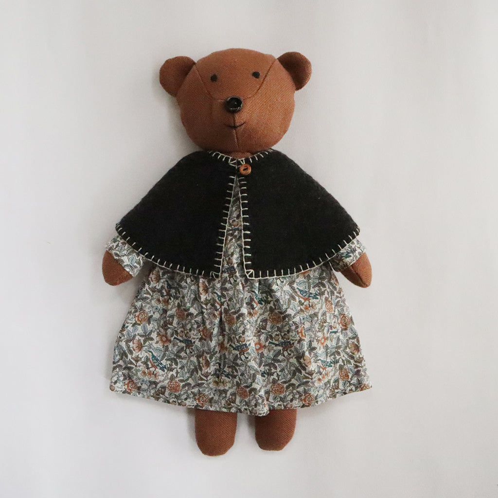 ウールのケープの周囲にはウール糸でブランケットステッチを入れて完成です。木のボタンに革のループを付けた本格的なつくりになっています。
