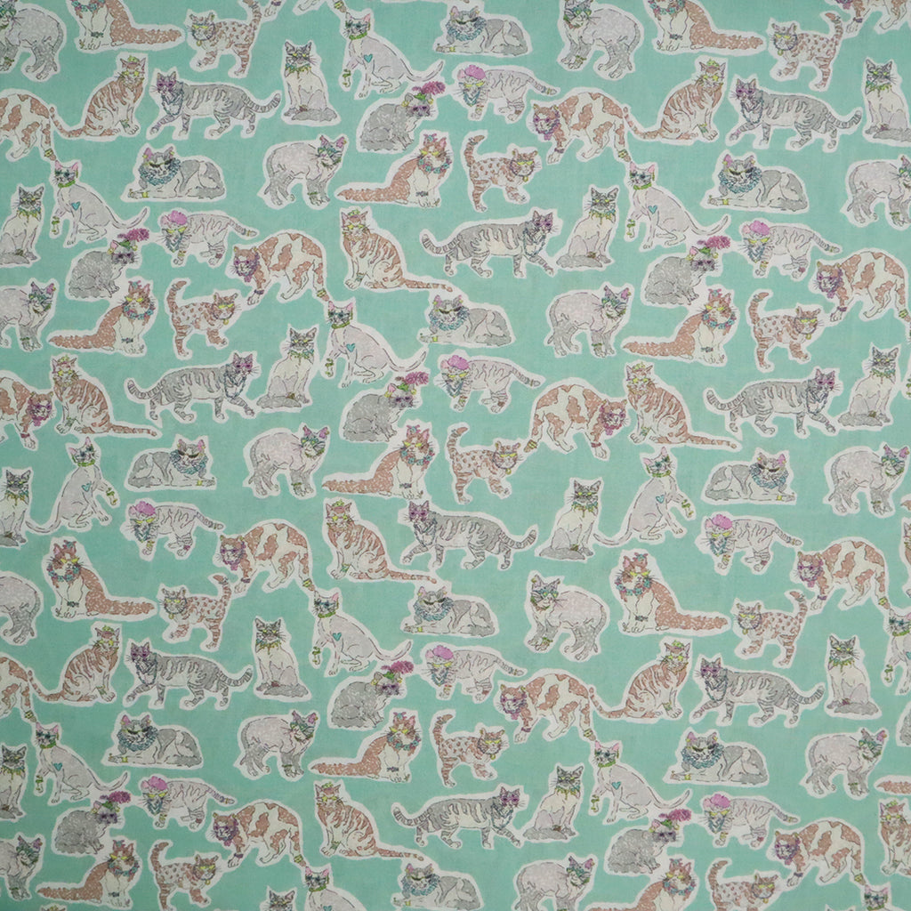 ロンドンのリバティ・ファブリックス・スタジオでデザインされた「ウィロビー・ミューズ」は、遊び心溢れるカンバセーショナルデザインです。点描マーカーを重ねて作られた繊細なテクスチャーが特徴のこのデザインには、サングラスやジュエリー、さらには孔雀の羽の帽子を身につけて、スタイリッシュに決めた猫たちが描かれています。