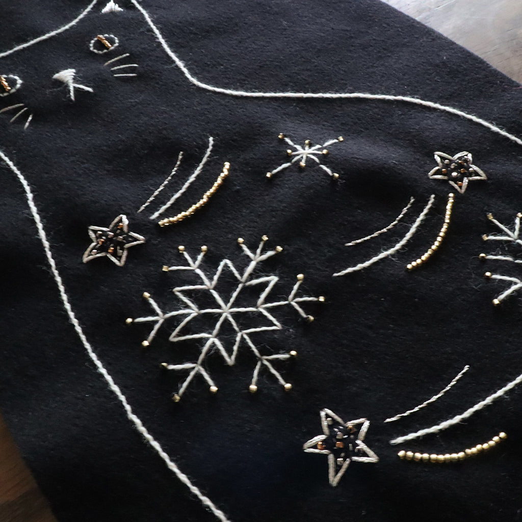 オフホワイトのウール糸に、ラメ糸やビーズを加えて星や雪の結晶を刺しゅうします。黒い生地にさりげなくきらめく糸が映え、冬のインテリアにぴったり。