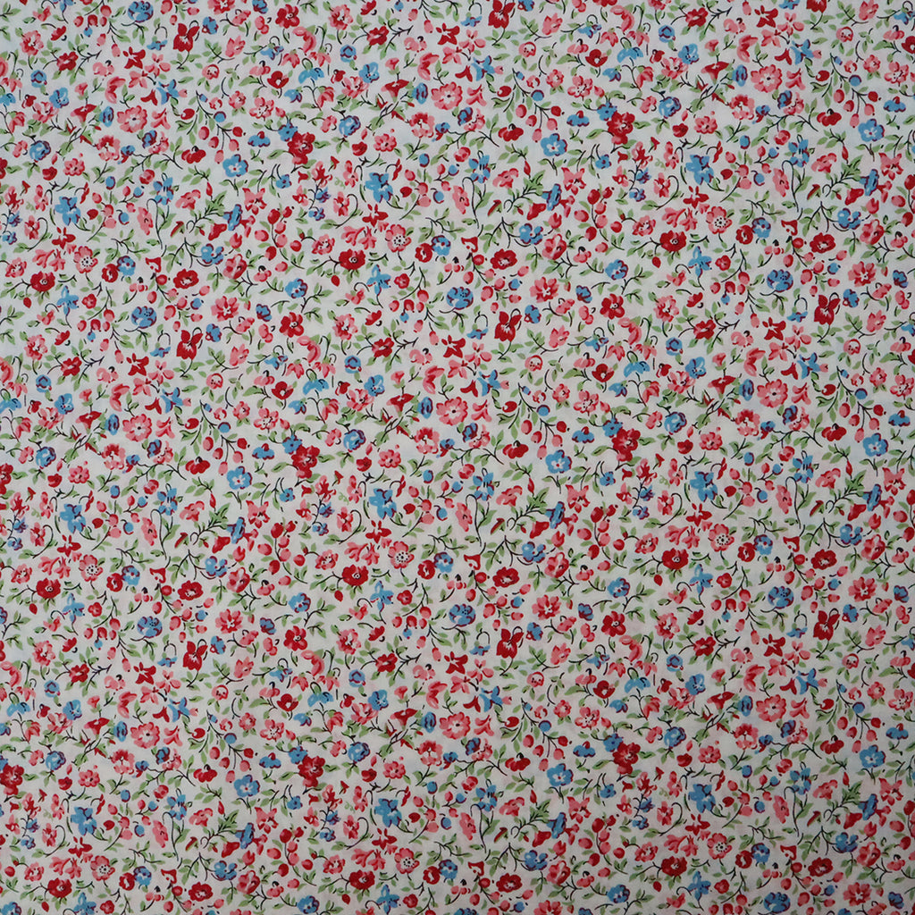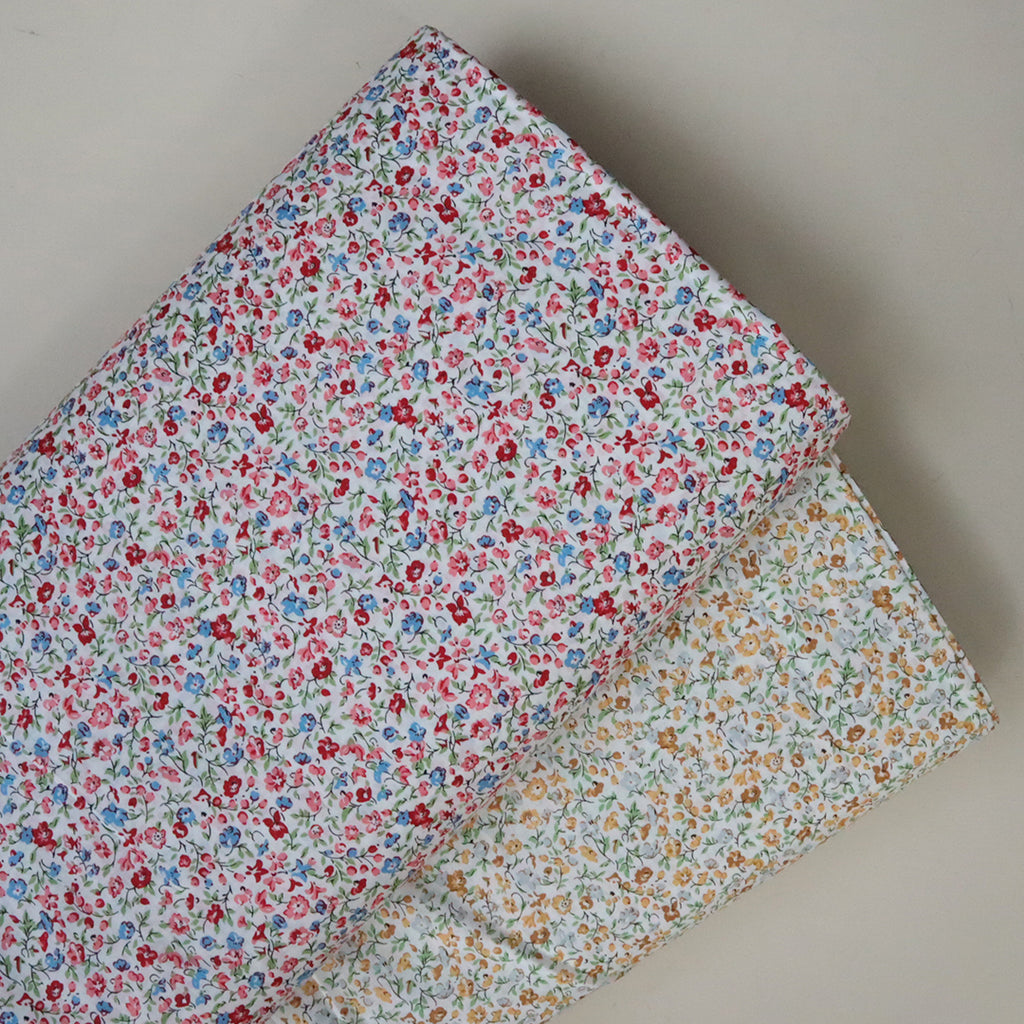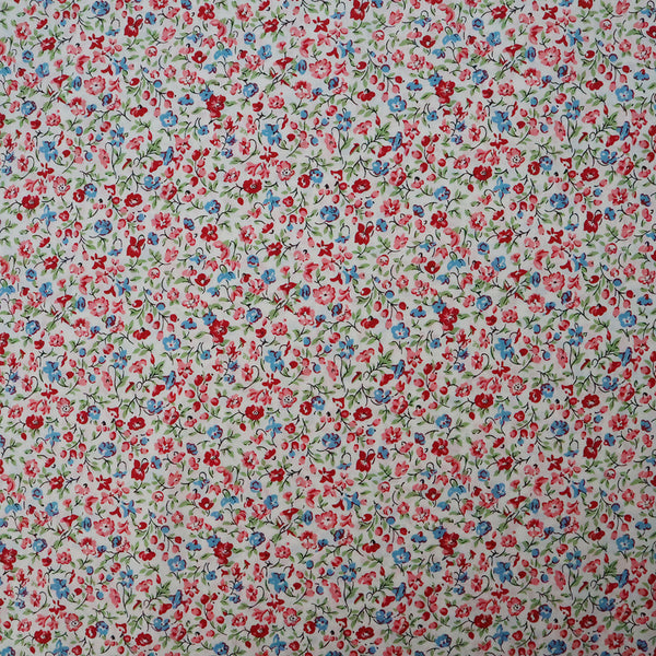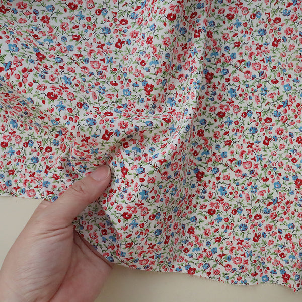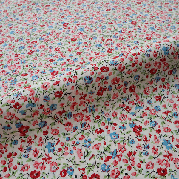 イギリスを代表するテキスタイルスタジオ「シルバースタジオ」によって1944年に生み出され、翌年の1945年にリバティプリントとして登場しました。繊細でスケッチ風のフローラルデザインには、小さなバラやスミレ、デイジー、ベリーが描かれ、ふんわりとした葉や風に舞う小枝と絡み合いながら、陽だまりの草原のロマンチックな雰囲気を表現しています。