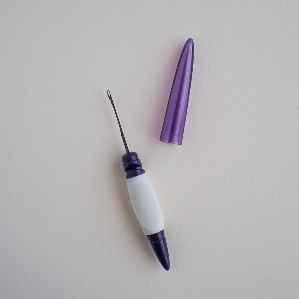 カギ先に糸をひっかけて引き抜くことでロックミシンの糸端始末が簡単にできます。使わない時は持ち手部分がキャップになりカギ先を安全に保管します。