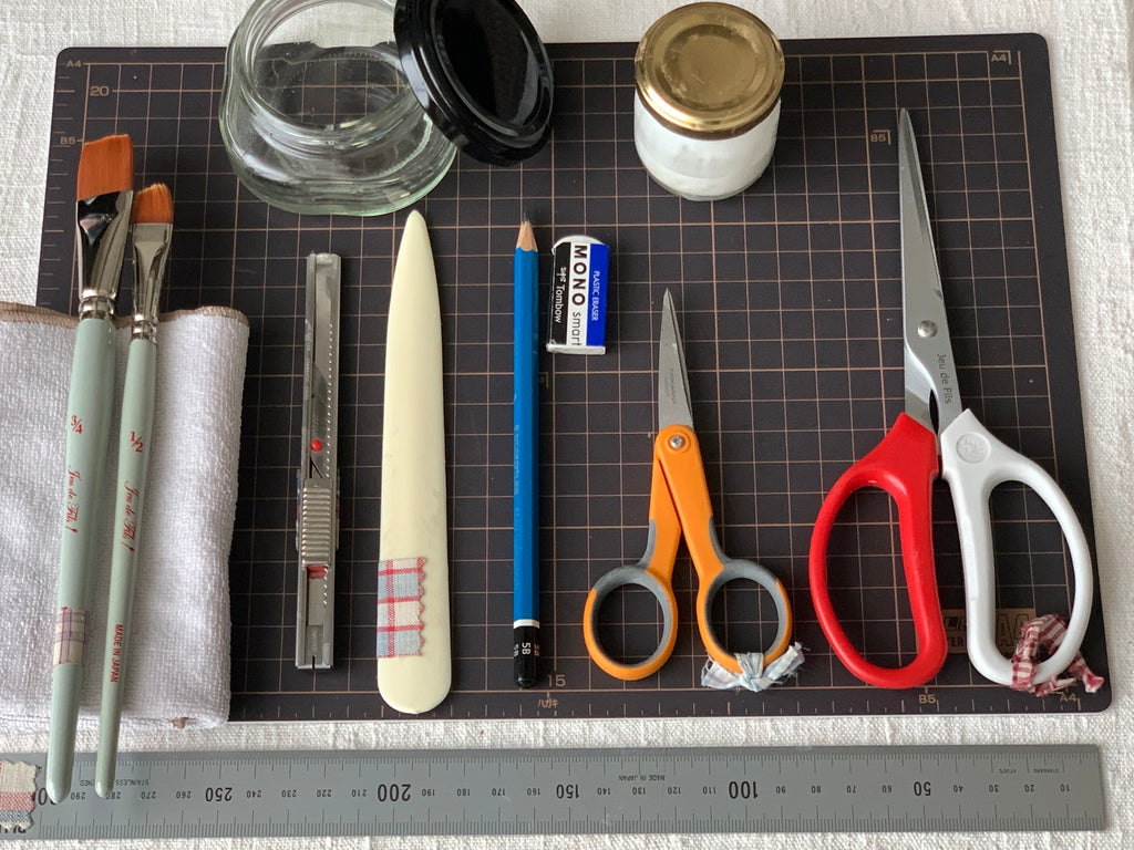 2回目:カルトナージュ用糊、カッターマット(A4くらい)、ステンレス定規、はさみ(布用・紙用)、消しゴム、鉛筆またはシャープペンシル、ヘラ、カッターナイフ、ハンドタオルなど、筆、空き瓶