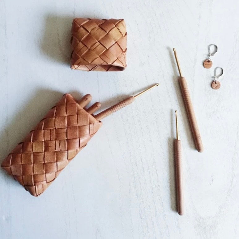 かご編みの応用編。細々した道具を入れたり、メガネケースとしても人気のデザインです。