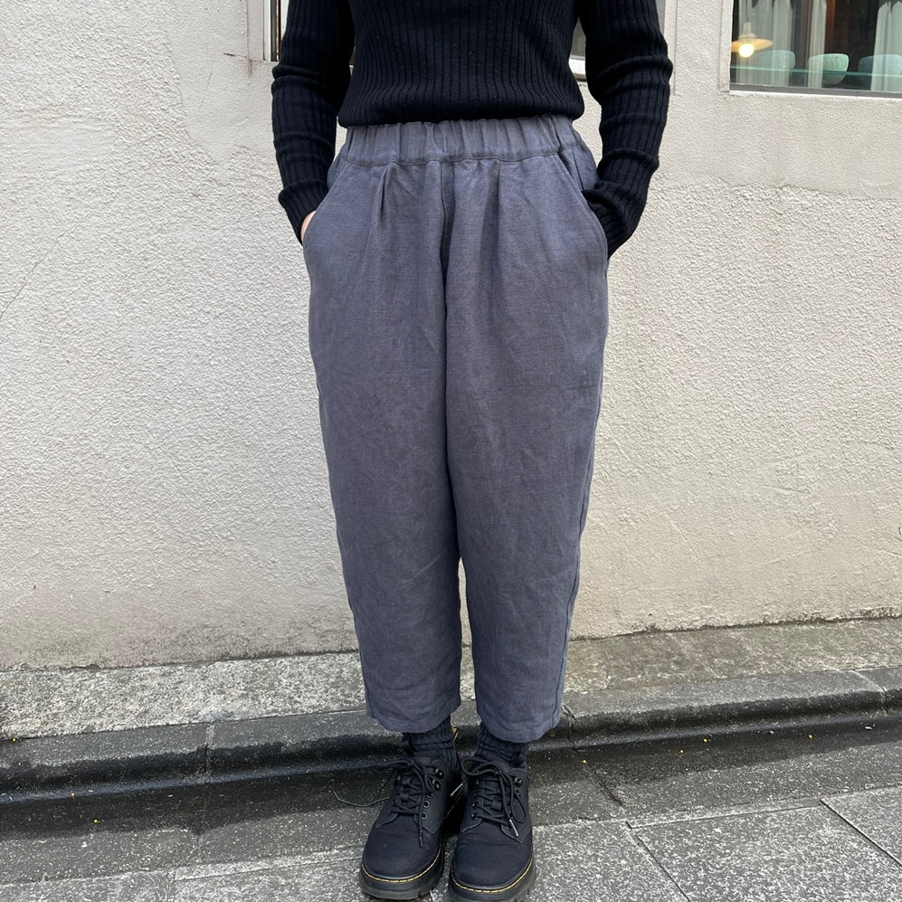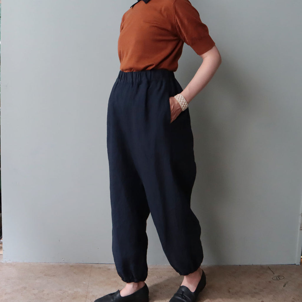 ウエストと裾にギャザーが入ったイージーパンツ。ウエストゴム、脇ポケット付き。裾をゴムで絞ります。