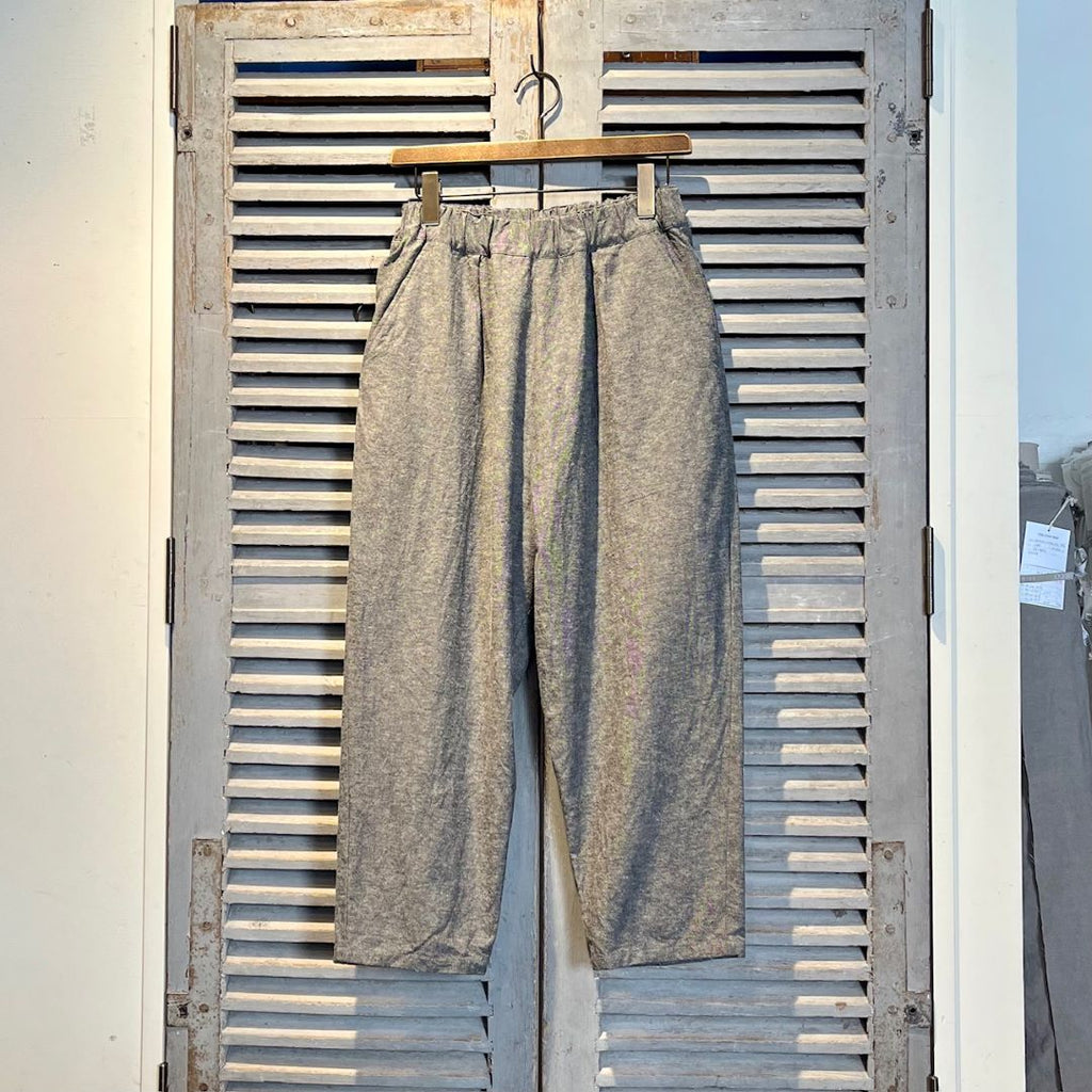 腰回りがゆったりとしていて裾口にむけてスッキリとしたデザインのパンツ。ウエストゴム、脇ポケット付き。