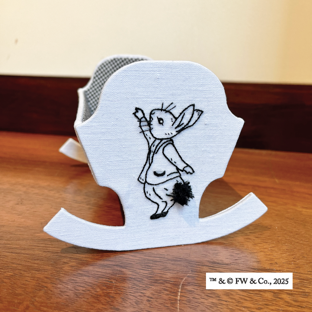側面にアウトラインステッチの技法で可愛らしいピーターラビット™の刺繍を施します。